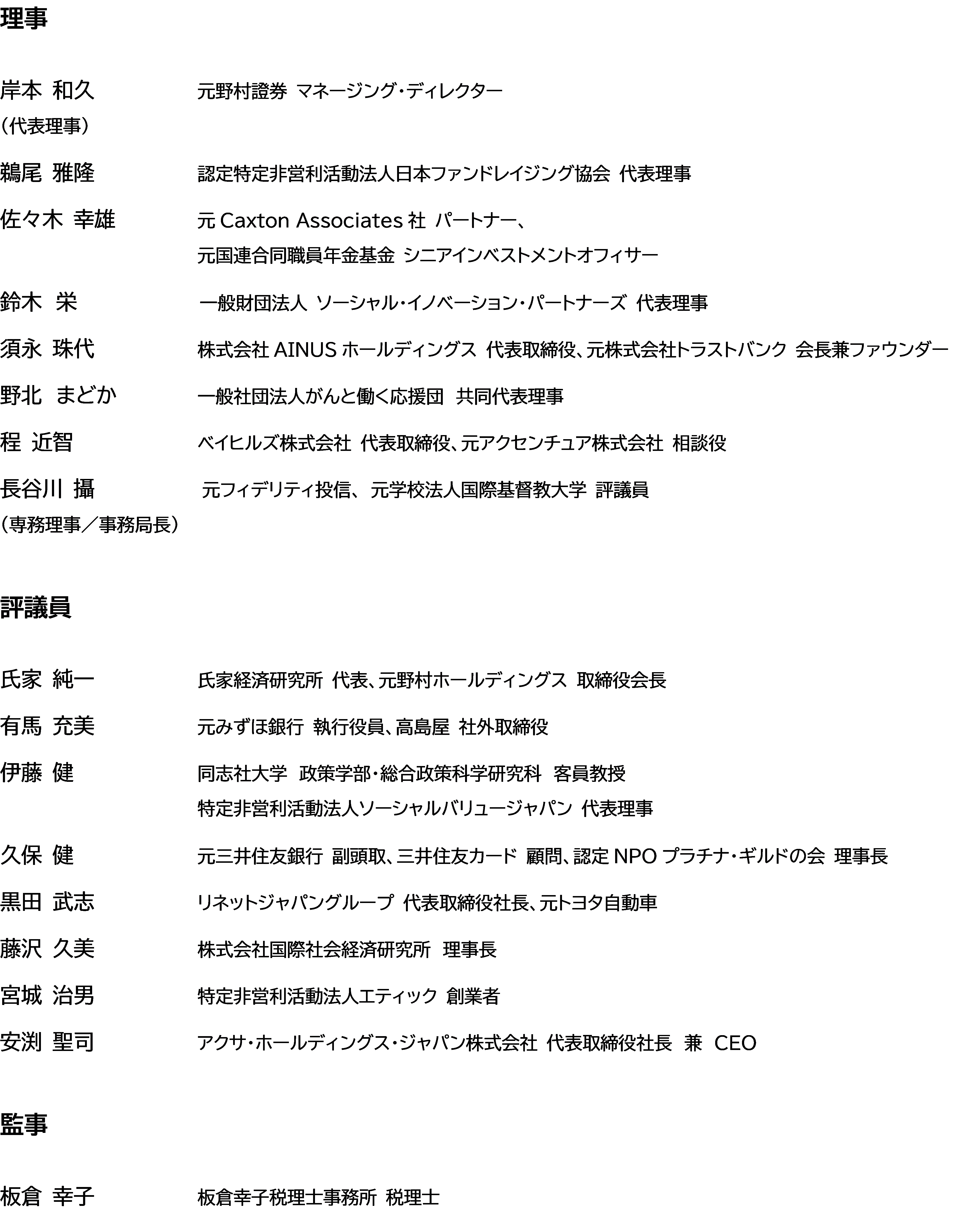 今般、公益財団法人日本フィランソロピック財団は、鈴木栄氏を理事に迎え、役員体制を以下としましたので、お知らせいたします。 新体制では、理事8名、評議員8名となりました。